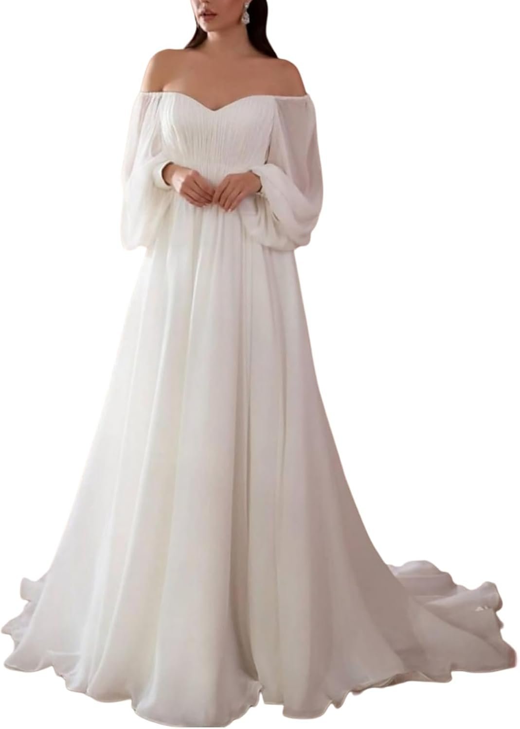 - Design Details:This bridal wedding dress features v neck,off the shoulder,long sleeve,chiffon,a line,zipper back