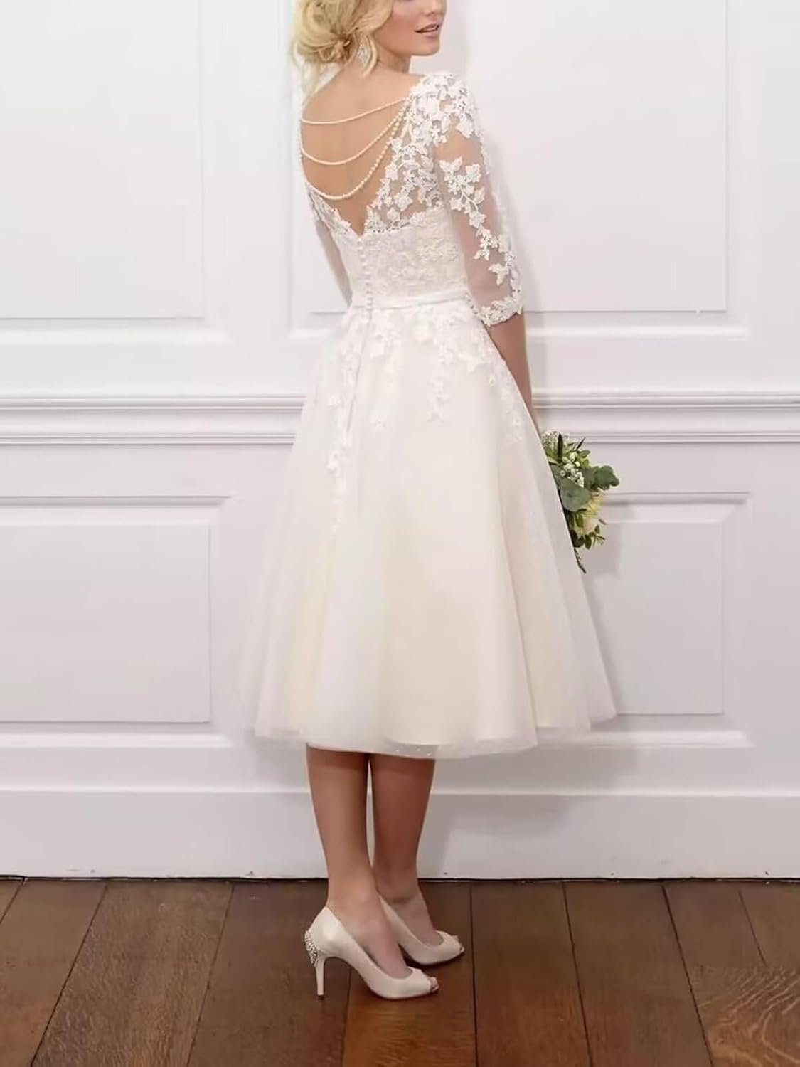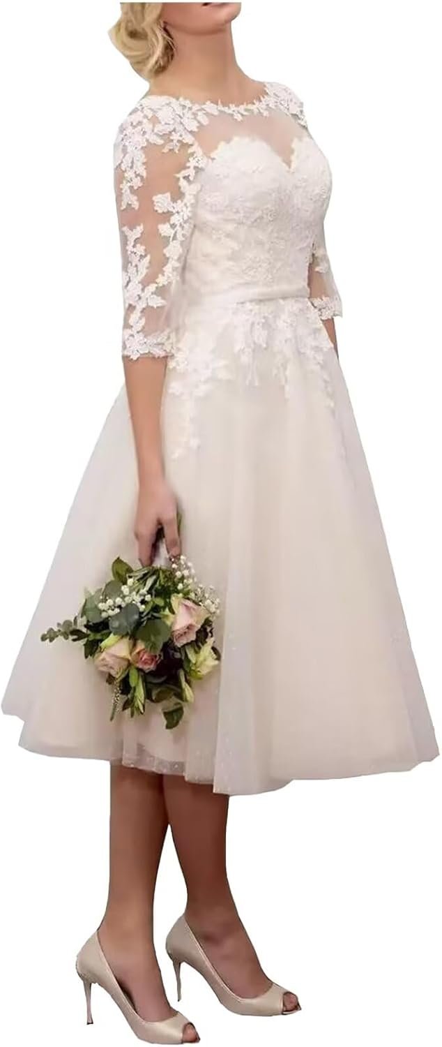 • Features:Courthouse lace short wedding dresses for bride,a line simple wedding dress for women,knee length bridal shower dresses for bride,column square neck formal engagement elopement dresses,built-In bra,fully lined.