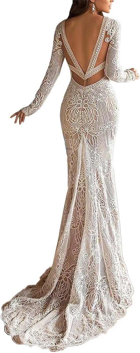 Women’s Beach Wedding Dresses for Bride 2025 Vintage Long Sleeves Lace Bohemian Meramaid Bridal Gown